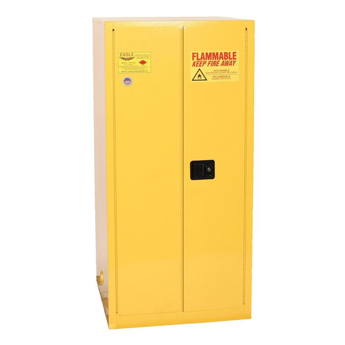 The Eagle 55 Gallon, manual close, Vertical Drum Storage Safety Cabinet, can safely contain a 55-gallon drum of flammable liquid. The cabinet features a convenient half shelf for additional storage space for accessories or containers and drum supports to keep drums elevated off cabinet sump.