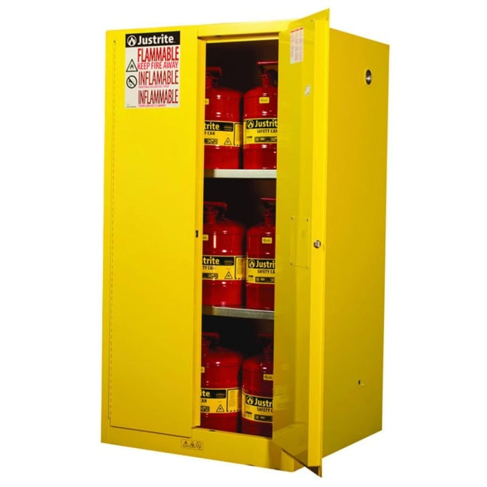 One of the leading causes of industrial fires is the improper storage and handling of flammable liquids. The Justrite Standard Sure-Grip® EX Flammable Safety Cabinet with Manual Close Doors (model 896000) is designed to safely store flammable liquids. Its exterior dimensions are 65 in H x 34 in W x 34 in D (1651 mm H x 864 mm W x 864 mm D). These yellow cabinets can store 60 gal (227 L) of flammable liquids.