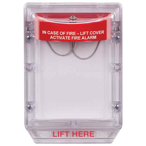 The cover accommodates most manual pull stations. When the Stopper II with horn is lifted to gain access to the protected alarm, a piercing self-contained 95 or 105 dB warning horn (at one foot) sounds.